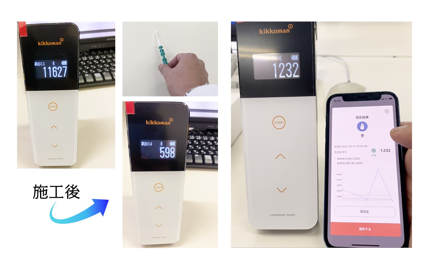 日本製の消毒用アルコールと、日本製の次亜塩素酸水を入れた専用ボトルを、従業員全家庭に人数分配布。
